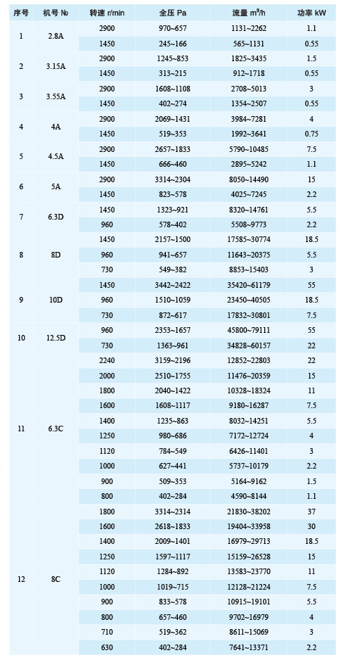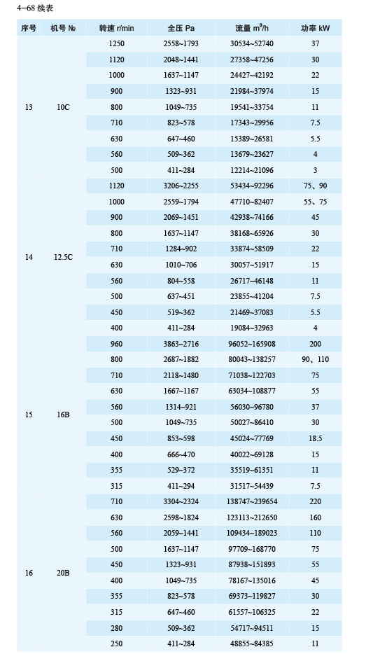 4-68通風機和引風機均為單吸入,有8#、9#、10#、11.2#、12.5#、14#、16#共七個機號。每種風機均可制成右旋或左旋兩種形式。風機的傳動方式均為D式,電機與風機聯接采用彈性聯軸器直聯傳動。